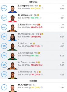 Changes to the starting lineup will be switching out the QBs, obviously adding Le’Veon Bell back in, and a likely FLEX trio of Hines, Johnson, and Darrel Williams. If KC is healthy and DW looks to be in a 3 man committee this weekend, I would sub in Deebo Samuel. Jaylen would probably get in over Hines if Conner (knee) is ruled out. With mid-week injuries seeming to pop up like never before, it’s good to have options.