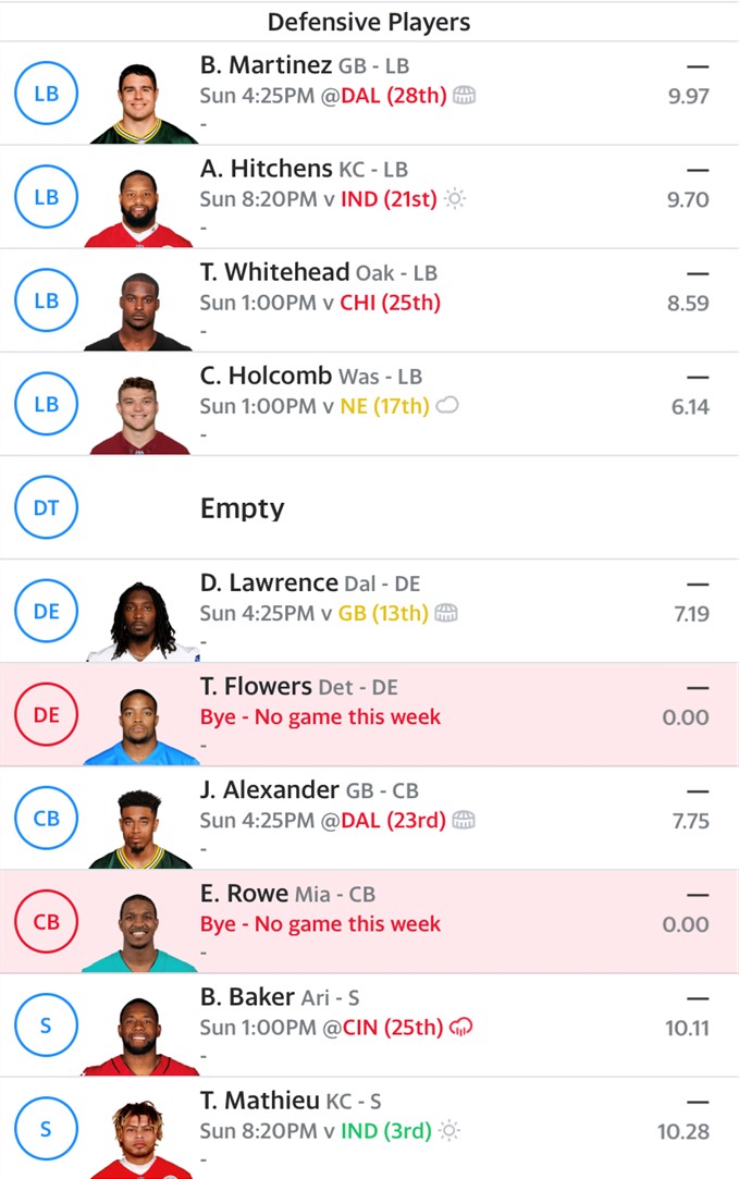Defensive Line – We’ve got some holes to fill along the DL this week due to byes as a DE and DT spot are open. Carlos Dunlap is available and jumps off the page going up against a Cardinals line that has allowed the most sacks in the NFL. He should be a fine choice to wreak havoc on the field and in our lineup. This league has a DT specific spot so we’d be looking for run stuffers that can rack up tackles. This is a low scoring position, but we have to start someone and will go with Sheldon Richardson. He’s safe to produce about 5 fantasy points which will play.