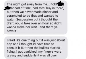 The other night I was sitting around, flipping channels when my phone started blowing up with “911” and then “we’ve got a bleeder!” The messages were from a friend of mine who isn’t much of a fantasy footballer but he and his wife (we’ll call them P&E) were wrangled into a couple’s league with some neighborhood friends. It is a 13 team, standard scoring league with a 1/2/2/1/1 starting roster. I watched in horror as the texts continued: