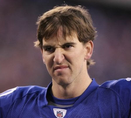 Eli Manning – 23/37, 200 YDS, 1 TD, 2 INT and 1 CAR, 12 YDS. THIS ELI MANNING, I CALL HIM “COCA COLA”, BECAUSE I ENJOY THE CLASSIC BETTER THAN NEW. You know, just looking at him, I assume that Eli has to wear a helmet all the time. Like in the locker room, they probably make him wear his “outdoors” helmet along with that demeaning child-leash attached to a parental unit, just to make sure he doesn’t get his head stuck in storm drains or pickle jars. So when you think of it that way, you begin to understand why he played so poorly last night. I mean, that game was way past his bedtime.