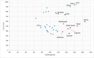 One way to identify values is to target efficient performers that are in line for increased use. Using that strategy, I reviewed the top 12 TEs in Hog Rate (HR) which is a players targets/snap played. The graph below shows 2018 HR with the top 12 highlighted vs. snaps played at the TE position: