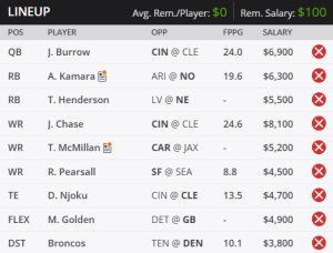 These two linked up for 23.7 PPR fantasy points per game last season. That was four full PPR points better than WR2. Chase went for 17 (WR12) and 22 (WR9) against CLE in their two matchups. They’ve looked locked in over preseason. I was thrilled to fit these two elite options in my Week 1 DFS lineup.
